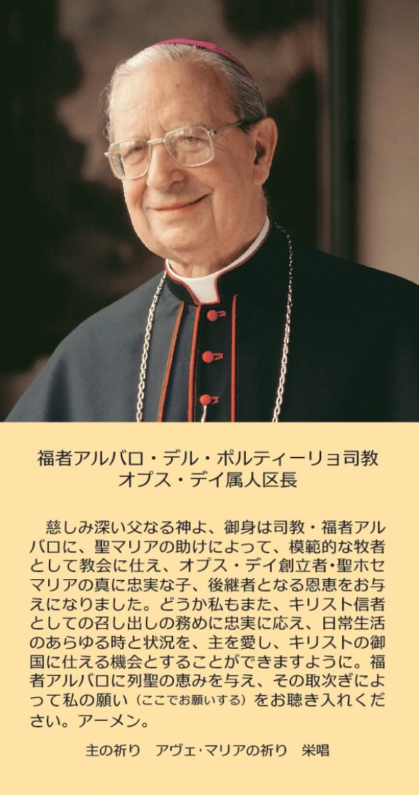 慈しみ深い父なる神よ、御身は司教・福者アルバロに、聖マリアの助けによって、模範的な牧者として教会に仕え、オプス・デイ創立者・聖ホセマリアの真に忠実な子、後継者となる恩恵をお与えになりました。どうか私もまた、キリスト信者としての召し出しの務めに忠実に応え、日常生活のあらゆる時と状況を、主を愛し、キリストの御国に仕える機会とすることができますように。福者アルバロに列聖の恵みを与え、その取次ぎによって私の願い(ここでお願いする)をお聴き入れください。アーメン。