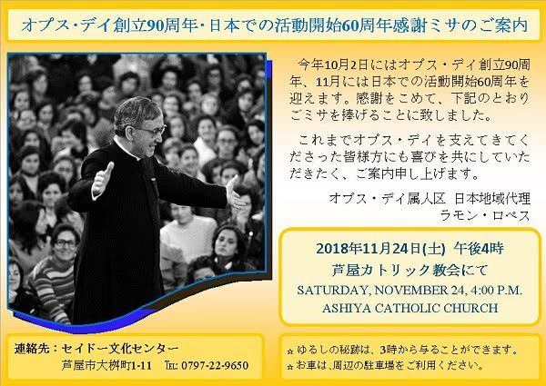 今年10月2日にはオプス・デイ創立90周 年、11月には日本での活動開始60周年を 迎えます。感謝をこめて、下記のとおり ごミサを捧げることに致しました。