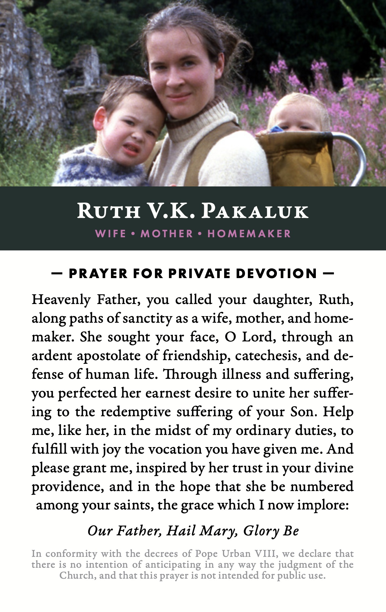 가톨릭으로 개종한 후 그녀는 가족을 키우고 생명 보호 운동에 헌신했습니다. 33세에 루스는 암 진단을 받았습니다. 1998년에, 41세로 평화롭게 세상을 떠나기 직전, 그녀는 친구에게 이렇게 썼습니다: “나는 하느님께서 주신 삶을 사랑했습니다. 다른 어떤 삶을 살았더라면 하는 바람은 없습니다.”