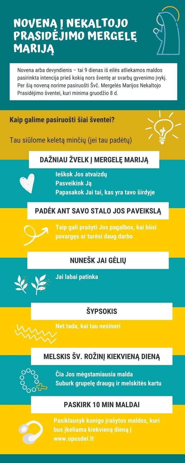 Tikėjimo tiesa ir truputis istorijos. 1854 m. popiežius Pijus IX iškilmingai paskelbė Marijos Nekaltojo Prasidėjimo dogmą. Paprastai švenčiame šį įvykį gruodžio 8 d. Tai reiškia, Marija nuo pirmos prasidėjimo akimirkos ypatinga visagalio Dievo malone ir privilegija dėl žmonijos Atpirkėjo Jėzaus Kristaus nuopelnų buvo apsaugota nuo gimtosios nuodėmės ir nė kiek jos nesutepta.