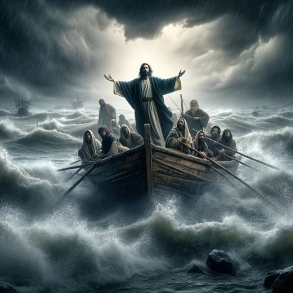 VĒTRA PLOSĀS. Viļņi kļūst vētraini. Ir skaidri dzirdams laivas koka čīkstēšana. Mācekļi, pieredzējuši zvejnieki, ir saspringti. Viņu pieredze liecina, ka vētra ir bīstama. Viņi brīnās, ka šajā kritiskajā situācijā Jēzus joprojām guļ. Viņi pamodina Viņu ar frāzi, kas zem pārmetuma šķietamības ir pilna pārliecības: "Skolotāj, vai Tev nerūp, ka mēs bojā ejam? Kungs pieceļas, aizrāda vēju un saka jūrai: "Klusē, klusē! Un vējš norima, un iestājās liels klusums. Tad Viņš tiem sacīja: "Kāpēc jūs baidāties? Vai jums vēl nav ticības?