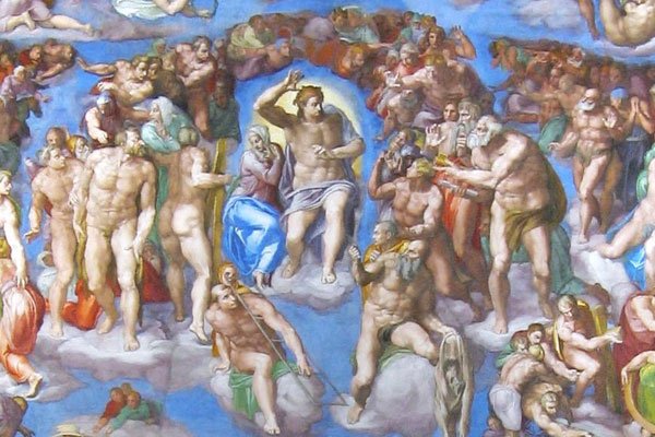 I Michelangelos mesterverk Dommedag i Det sixtinske kapell, ser vi Kristus i sentrum som tilsynelatende hersker over universet med en armbevegelse. Ved hans side er Vår Frue som ser medlidende på sine barn når de trer frem for den høyeste dommer. Disse to figurene er omgitt av et stort antall mennesker, helgener fra Det gamle og Det nye testamente, martyrer og apostler, som har blikket festet på vår Frelser.
