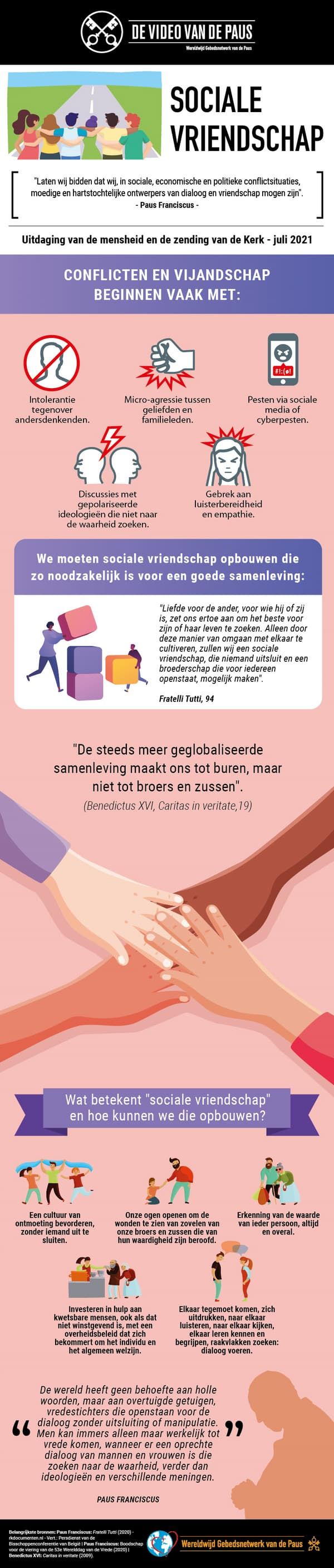 Vrienden maken in plaats van vijanden, elkaar begrijpen in plaats van met elkaar te vechten, “uit de polarisatie komen”, in de woorden van de Paus. Laten we elkaar de hand reiken en naar elkaar luisteren om samen te werken aan het algemeen welzijn. Deel dit bericht van Franciscus met je vrienden en ook, waarom niet, met degenen die dat niet zijn.