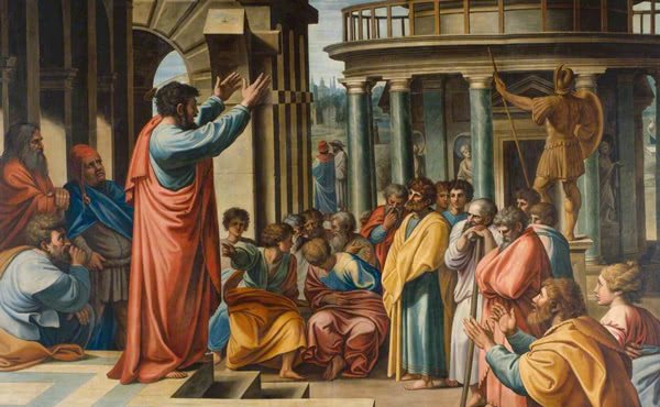 5. Ten tijde van Paulus was er ook een crisis gaande van de traditionele godsdienst, tenminste in haar mythologische en ook burgerlijke aspecten. Nadat Lucretius al een eeuw eerder polemisch gesteld had dat "de godsdienst tot zoveel misdaden had geleid" [9], leerde een filosoof als Seneca, daarmee ver uitgaande boven elke vorm van uiterlijk ritualisme, dat "God jou nabij is, dat Hij met je is en in je is" [10]. Analoog daaraan zegt Paulus, wanneer hij zich op de Areopaag van Athene richt tot een gehoor van epicureeërs en stoïcijnen, letterlijk: "God ... woont niet in door mensenhanden gemaakte tempels ... want in Hem leven wij, bewegen wij en zijn wij" (Hand. 17, 24.28). Daarmee geeft hij zeer zeker nauwkeurig het joodse geloof weer in een God die niet in antropomorfe termen is voor te stellen, maar tegelijk plaats hij zich op een religieuze golflengte die zijn toehoorders goed kenden.