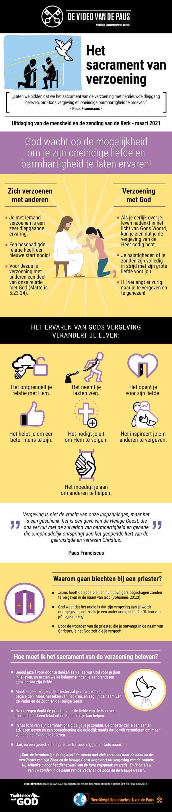 Franciscus zegt ons: “Als ik ga biechten, is dat om gezond te worden, om mijn ziel te genezen. Om spiritueel gezonder weer op weg te gaan.” De paus nodigt ons uit om dit sacrament van liefde dat je leven verandert, te beleven: “Het centrum van de biecht zijn niet de zonden die we belijden, maar is de goddelijke liefde die we ontvangen en die we altijd nodig hebben.” God is groter dan onze zonden. Deel deze blijde boodschap met iedereen van wie je houdt en kom naar het sacrament van vergeving om de oneindige barmhartigheid van de Heer te proeven. Het is een cadeau voor jou!