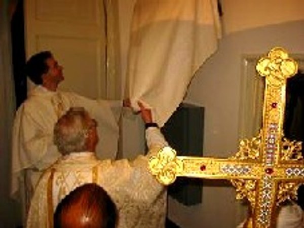 Deken Stam onthult de gevelsteen van de Heilige Stede.