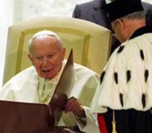 Bij de ceremonie waren, naast de Italiaanse president Silvio Berlusconi en andere ministers en academische autoriteiten, enkele duizenden studenten aanwezig. De rechtenfaculteit verleent aan Johannes Paulus het doctoraat honoris causa wegens “de inzet van de paus gedurende zijn gehele pontificaat voor de verdediging van de mensenrechten, zowel wat betreft de rechten van het individu als de rechten in de relaties tussen de volkeren”.