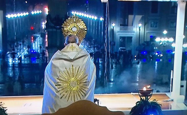De Paus liep met Allerheiligst Sacrament in de monstrans naar de centrale deur van de Sint Pieter naar het plein en waarna Christus in het Allerheiligst Sacrament zegent.
