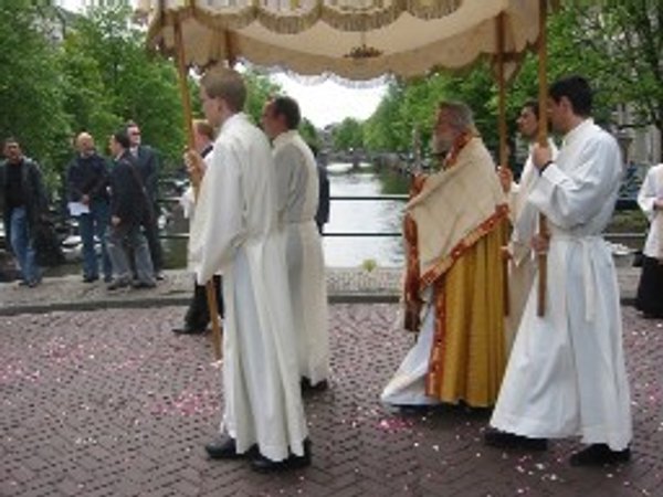 Meer dan duizend gelovigen liepen vanuit de kerk aan de Keizersgracht mee naar het Begijnhof. Zingend en biddend begeleidden ze de bisschop van Haarlem, mgr. Jozef Punt, die onder een baldakijn het heilig sacrament in een monstrans droeg.