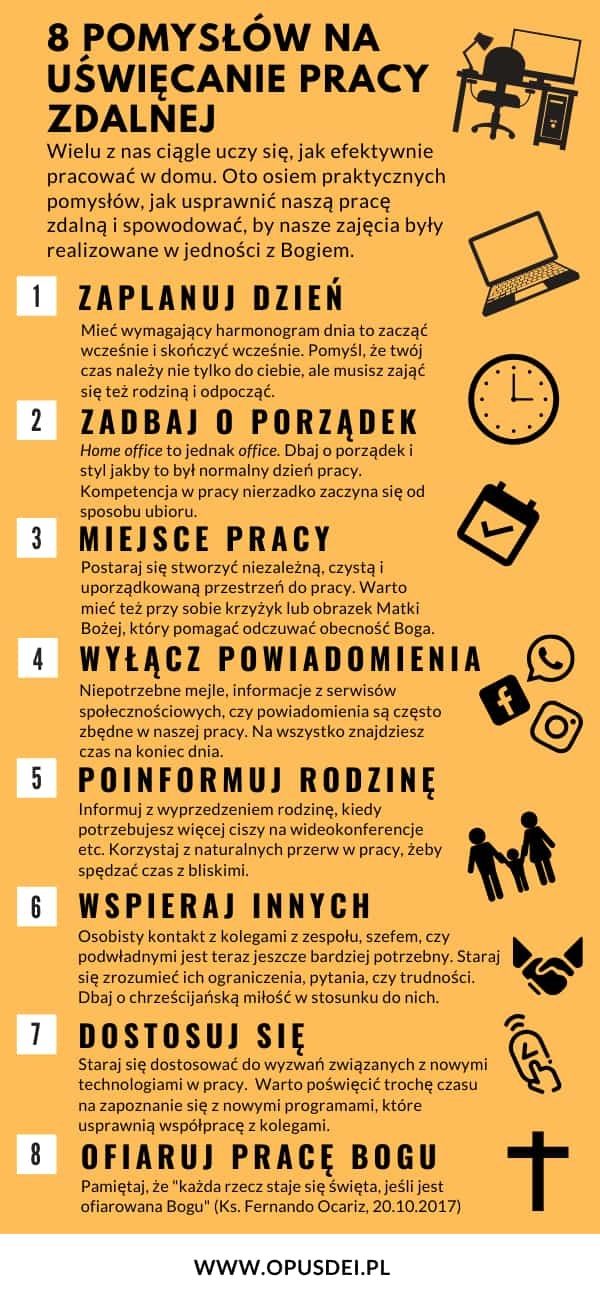 Niektóre badania zalecają posiadanie wyłącznej przestrzeni do pracy, choć w warunkach domowych może to być trudne do osiągnięcia. Postaraj się stworzyć niezależną, czystą i uporządkowaną przestrzeń dla siebie. Doświadczamy tego także w przestrzeni wirtualnej – wszyscy wiemy, że dobrze jest mieć na komputerze schludnie przechowywane i usystematyzowane foldery. Przy okazji, dobrze byłoby mieć blisko siebie dyskretny (prawdziwy lub wirtualny) krucyfiks lub obraz Matki Bożej, który wspomaga nas w odczuwaniu obecności Boga.