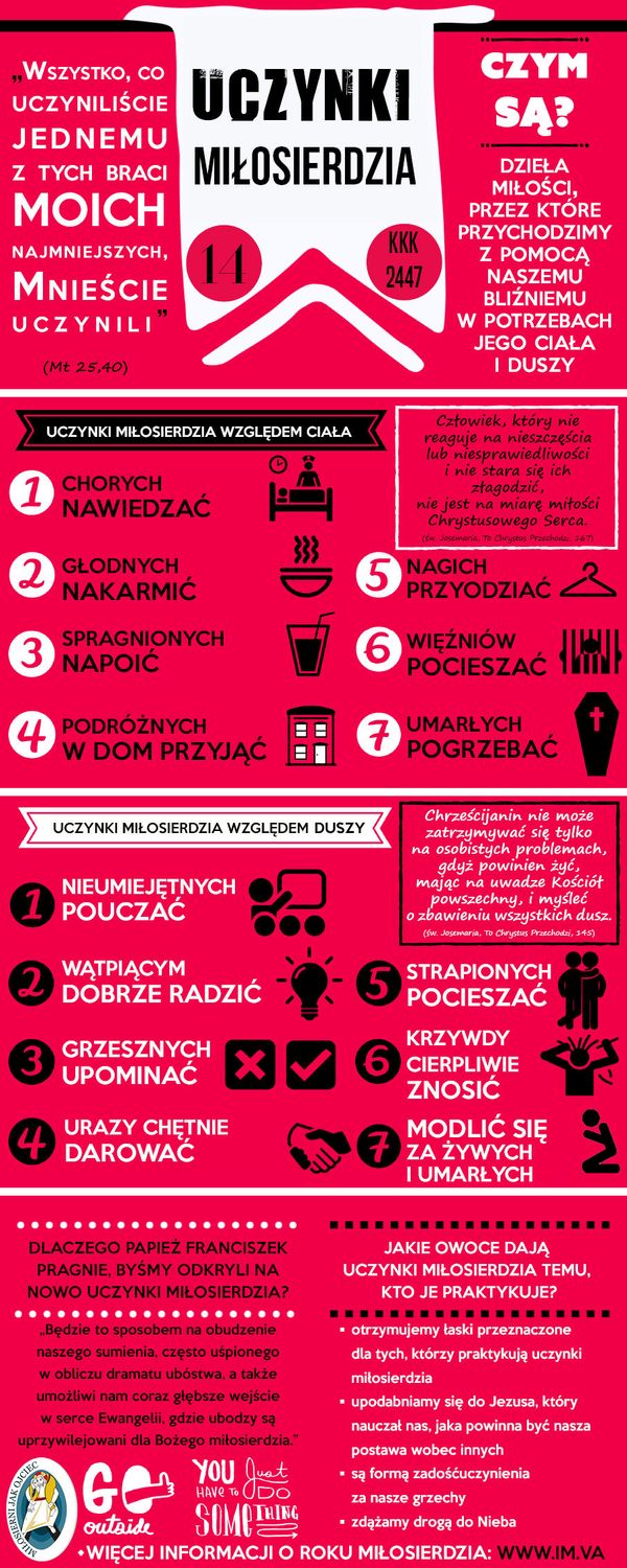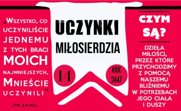 „Uczynkami miłosierdzia są dzieła miłości, poprzez które pomagamy bliźnim w potrzebach ciała i duszy. Pouczać, radzić, pocieszać, umacniać, jak również przebaczać i krzywdy cierpliwie znosić - to uczynki miłosierdzia co do duszy. Uczynki miłosierdzia co do ciała polegają zwłaszcza na tym, by głodnych nakarmić, bezdomnym dać dach nad głową, nagich przyodziać, chorych i więźniów nawiedzać, umarłych grzebać. Spośród tych czynów jałmużna dana ubogim jest jednym z podstawowych świadectw miłości braterskiej; jest ona także praktykowaniem sprawiedliwości, która podoba się Bogu” (Katechizm Kościoła Katolickiego 2447)