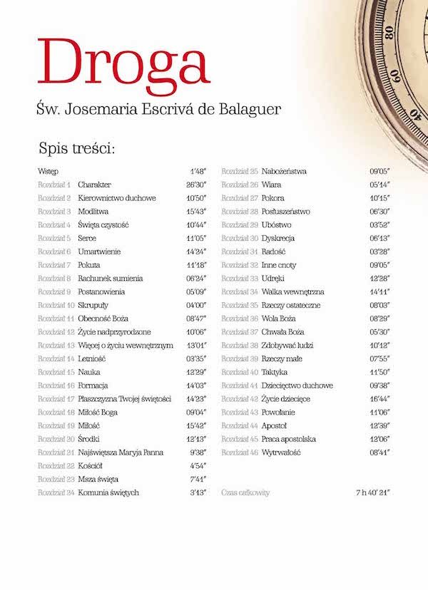 Droga (Camino) - to sztandarowe dzieło św. Josemarii Escrivy. Zawiera zebrane w 999 punktach rozważania duchowe, będące owocem modlitwy wielkiego świętego XX wieku. Te krótkie, kilkuzdaniowe teksty poruszają do głębi, wstrząsają sumieniem, mobilizują do walki o własną duszę.