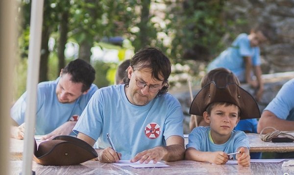 W tym roku tematyka obozu związana była z korsarzami i chociaż mogłoby się wydawać, że nie jest to najbardziej odpowiednia przestrzeń do przekazywania dobrych wartości, organizatorzy znaleźli na to sposób. – Mówimy chłopakom, że jesteśmy korsarzami Pana. Na koniec robimy salwę honorową na cześć pań, które nam gotowały, a później był wydany żołd. Chłopcy dostali perły, złoto, mieli też broń i statek, byli gotowi do walki o dobro – tłumaczy D. Sokołowski. Pokazuje też patent żeglarski, który każdy z ojców wręczył swojemu synowi. W jego treść wpisane są bezpośrednie odniesienia do słów z Pisma św. zachęcające do gromadzenia sobie prawdziwych skarbów w niebie. Namawiają również do przygód, odkryć i do nieustannej walki ze złem. – W ojcostwo jest wpisana przygoda, ale bycie ojcem idzie dużo dalej. Jesteśmy powołani do przekazania pełni życia. To jest odpowiedzialność, aby dziecko, które jest pod moją opieką bardziej stawało się człowiekiem i budowało całkowicie niezależne życie. Jednym z ważniejszych elementów ojcostwa jest przygoda, ale jego treść jest znacznie bogatsza. Zakładamy krótkie spodenki i idziemy się bawić, ale czasami trzeba założyć koszulę i krawat, i poważnie rozmawiać – dodaje.