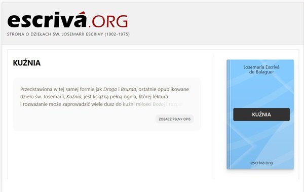 Przedstawiona w tej samej formie jak Droga i Bruzda, ostatnie opublikowane dzieło św. Josemaríi, Kuźnia, jest książką pełną ognia, której lektura i rozważanie może zaprowadzić wiele dusz do kuźni miłości Bożej i rozpalić je pragnieniem świętości i apostolstwa; takie właśnie było pragnienie Prałata Escrivy de Balaguera, (Prałat Álvaro del Portillo, Wprowadzenia). Pierwsze wydanie jest z roku 1987. Do tej porywydano więcej niż 0,4 mln egzemplarzy w 14 językach.