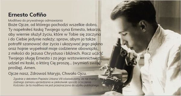 Boże Ojcze, od którego pochodzi wszelkie dobro, Ty napełniłeś łaską Twojego syna Ernesto, lekarza, aby wiernie służył życiu, które w Tobie się zaczyna i do Ciebie jedynie należy; spraw, abym ja także potrafił szanować dar życia i ukazywać jego piękno oraz hojnie wypełniał moje codzienne obowiązki, z miłości do Jezusa Chrystusa i bliźnich. Racz uczcić Twego sługę Ernesto i za jego wstawiennictwem udziel mi łaski, o którą Cię proszę... (wymień swoją prośbę). Amen.