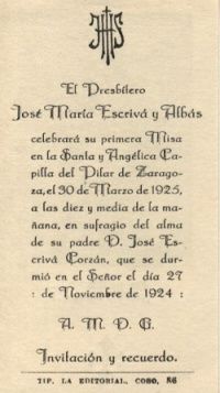 „Prezbiter José María Escrivá y Albás odprawi swą Prymicyjną Mszę Świętą w Świętej i Anielskiej Kaplicy Najświętszej Maryi Panny del Pilar w Saragossie, 30 marca 1925 roku, o 10.30 rano, w intencji duszy jego ojca don José Escrivy Corzána, który zasnął w Panu 27 listopada 1924 roku.
