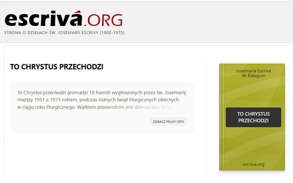 To Chrystus przechodzi gromadzi 18 homilii wygłoszonych przez św. Josemaríę między 1951 a 1971 rokiem, podczas różnych świąt liturgicznych obecnych w ciągu roku liturgicznego. Wątkiem przewodnim jest dziecięctwo Boże, z którego wypływa powszechne powołanie do świętości, uświęcenie codziennej pracy, kontemplacja pośród świata, jedność życia. Pierwsze wydanie jest z roku 1973. Do tej pory wydano około 500 tys. egzemplarzy w 14 językach.