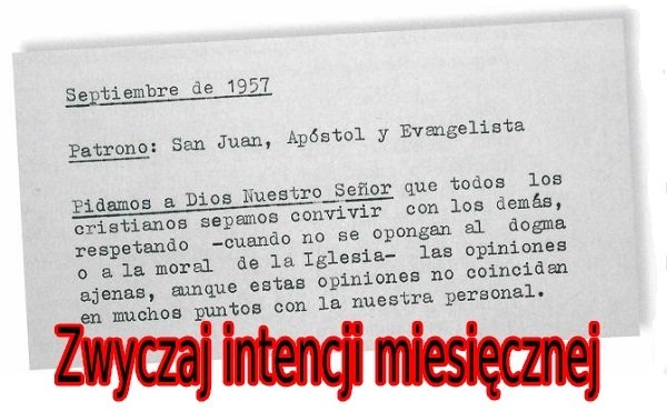Ogólna intencja miesięczna, a także ta, która jest skonkretyzowana przez dany region, pomaga nam modlić się jednocześnie wszystkim razem, będąc zjednoczonymi z Ojcem i kierownictwem Dzieła. Ułatwia nam kochać z Dziełem, czuć z Sercem Chrystusa, myśleć z Tym, który jest głową wśród nas... To jest prawdziwa jedność, właściwa dla zdrowego ciała, w pełni życia[4].