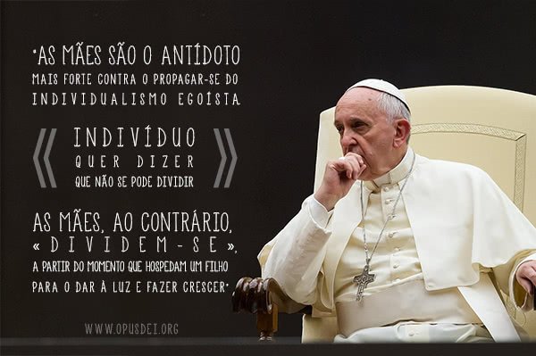 3. “Sim, ser mãe não significa somente colocar um filho no mundo, mas é também uma escolha de vida. O que escolhe uma mãe, qual é a escolha de vida de uma mãe? A escolha de vida de uma mãe é a escolha de dar a vida. E isto é grande, é bonito". Audiência Geral, 7 de janeiro de 2015.