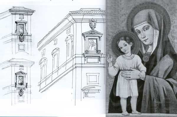 Após várias semanas e depois de várias visitas à praça para encontrar alternativas, apresentei a D. Álvaro uma possível solução, com as correspondentes fotomontagens e desenhos: substituir uma janela, na esquina do edifício que há entre o Cortile de São Dâmaso e a praça, por um mosaico de Nossa Senhora.