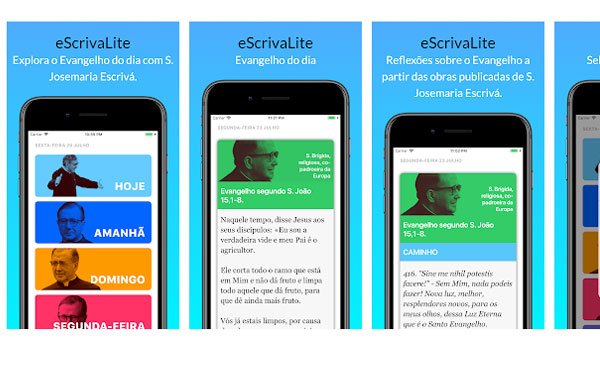 O aplicativo eScrivaLite oferece ao usuário uma forma fácil e atrativa de ler o Evangelho do dia e recordar os escritos publicados de São Josemaria relacionados com esse Evangelho. Oferece uma ferramenta para se aproximar de Deus no meio das tarefas profissionais e ali encontrar Jesus Cristo. Um dos pontos da época do Natal diz: “Filhos de Deus. - Portadores da única chama capaz de iluminar os caminhos terrenos das almas, do único fulgor em que nunca se poderão dar escuridões, penumbras ou sombras. O Senhor serve-se de nós como tochas, para que essa luz ilumine... De nós depende que muitos não permaneçam em trevas, mas andem por caminhos que levam até à vida eterna” (Forja, n. 1).