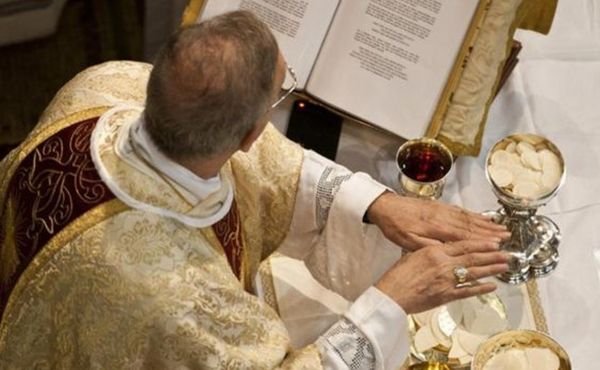 O sacerdote junta as mãos e pronuncia com clareza as palavras do Senhor tal e como a natureza das mesmas o requer[59]. Especialmente neste momento da celebração, o sacerdote atua in persona Christi, o que “o que quer dizer "em nome", ou então "nas vezes" de Cristo. "In persona": isto é, na especifica e sacramental identificação com o "Sumo e Eterno Sacerdote", que é o Autor e o principal Sujeito deste seu próprio Sacrifício, no que não pode, na verdade, ser substituído por ninguém”[60]. Trata-se para São Josemaria de uma realidade diáfana: “Sou, de um lado, um fiel como os outros; mas sobretudo sou Cristo no Altar! Renovo incruentamente o divino sacrifício do Calvário e consagro in persona Christi, representando realmente a Jesus Cristo, porque lhe empresto meu corpo e minha voz e minhas mãos, meu pobre coração, tantas vezes manchado, que quero que ele purifique”[61].
