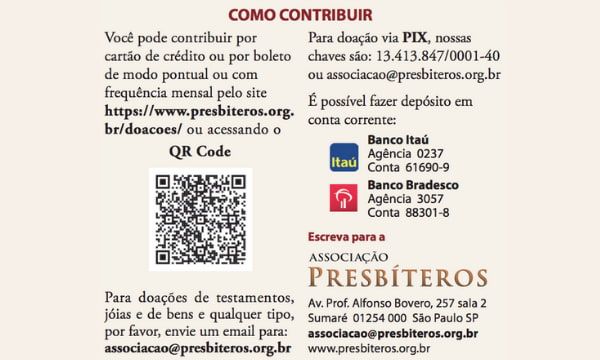 A Associação Presbíteros nasceu em 2010 com o propósito de apoiar a formação sacerdotal no Brasil, através de bolsas de estudo, cursos de atualização e outros subsídios. Para isso, contou com contribuição de pessoas generosas que compartilham a aspiração de garantir a excelência na formação às futuras gerações de sacerdotes da Igreja Católica.