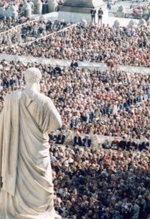Um rio humano corre pelas ruas de Roma, cheio de pessoas jubilosas que se dirigem a Praça de São Pedro, com os olhos fixos na fachada de Maderno, onde um alto-relevo representa o momento em que Jesus Cristo entrega as chaves da Igreja a um pobre pescador. Já alegrou o céu de Roma a fumaça branca, e a multidão expressa a sua alegria.