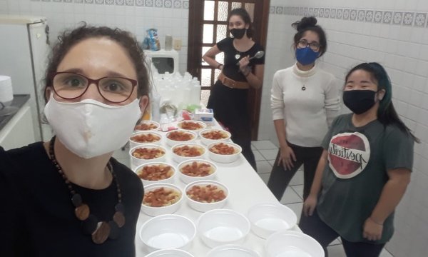 Realizadas com os vídeos e fotos que receberam dos idosos lendo suas cartas, as meninas decidiram ir mais além e promoveram também o projeto Marmita Solidária (assista aqui ao vídeo dessa iniciativa). O objetivo era preparar um jantar para os moradores de rua do centro de São Paulo. Fizemos uma campanha para arrecadar dinheiro e alimentos. No dia combinado, cada uma preparou em sua casa algumas marmitas e nos encontramos no Centro Mirante para finalizá-las: colocar em potes, acrescentar os talheres e guardanapos e incluir também um docinho para a sobremesa.