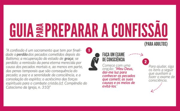 A confissão é a oportunidade de pedir perdão a Deus e de receber a sua misericórdia. Antes de se confessar, reserve uns momentos de silêncio para refletir no que você fez de errado; no que possa ter prejudicado outras pessoas, e no que você pode fazer para se tornar um cristão melhor. Uma confissão sincera permite a renovação da alma e a sua abertura à graça de Deus. As questões a seguir podem ajudar a refletir sobre as ações de que você deve pedir perdão.