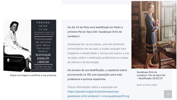 A capelania está promovendo no ISE uma exposição sobre esta professora e química espanhola, a partir do dia 16 de maio (Rua Martiniano de Carvalho, 573). No dia da beatificação a exposição estará no saguão do auditório do CEU (Rua Maestro Cardim, 370. Bela Vista, SP).