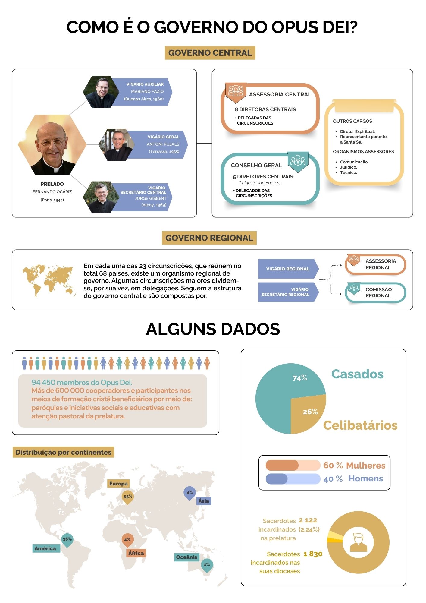 Este gráfico explica visualmente como o Opus Dei é governado no nível central e nos países em que está presente. Também oferece alguns dados atuais, como o número de fiéis e a distribuição por continentes.