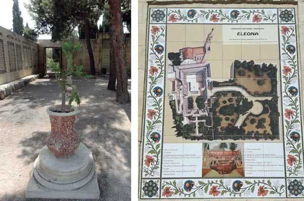 Entra-se no santuário de Eleona pela estrada de Betfagé. À direita, onde cresce um exuberante jardim, encontrava-se o pórtico da basílica bizantina; à esquerda, descendo umas escadas, chega-se ao convento das Carmelitas Descalças, com a igreja precedida pelo claustro; e no centro, sob o presbitério da construção abandonada, está a gruta do Pai-Nosso. Trata-se de um pequeno espaço, com uma entrada dupla que lembra a basílica da Natividade e remonta à época dos cruzados. Há dois ambientes: um restaurado e outro, ao fundo, reduzido a ruínas; foram aí encontradas sepulturas que poderiam datar-se dos primeiros séculos da nossa era.