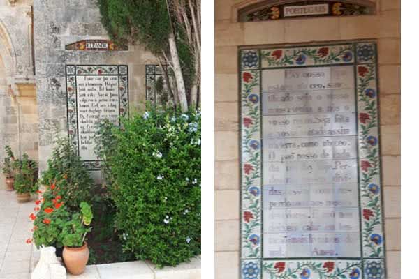 As paredes ao redor do recinto estão cobertas de painéis de cerâmica com o Pai-Nosso escrito em mais de setenta línguas. Como sabemos, a formulação tradicional inspira-se nos ensinamentos do Senhor que São Mateus recolheu: “Quando orardes, não useis de muitas palavras, como fazem os pagãos. Eles pensam que serão ouvidos por força das muitas palavras. Não sejais como eles, pois o vosso Pai sabe do que precisais, antes de vós o pedirdes. Vós, portanto, orai assim: Pai nosso que estás nos céus, santificado seja o teu nome; venha o teu Reino; seja feita a tua vontade, como no céu, assim também na terra. O pão nosso de cada dia dá-nos hoje. Perdoa as nossas dívidas, assim como nós perdoamos aos que nos devem. E não nos introduzas em tentação, mas livra-nos do Maligno”[5].