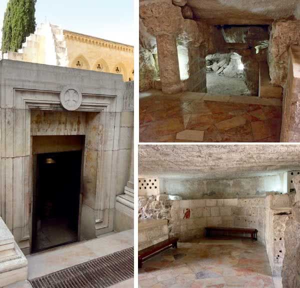 De fato, desde tempos muito antigos se venerava uma gruta junto ao caminho que vai de Betânia e Betfagé à Cidade Santa, no cume do monte das Oliveiras, muito perto do local onde se recordava a Ascensão. Jesus teria se retirado para aquela gruta muitas vezes com os apóstolos, teria instruído sobre muitos mistérios – entre outros, as previsões sobre o fim do mundo e a destruição de Jerusalém –, e teria transmitido a oração do Pai-Nosso. A recordação devia ser tão forte que Santa Helena mandou construir ali uma basílica no ano 326. Chamava-se Eleona – como o local onde se erguia –, tinha três naves e estava precedida de um grande átrio com quatro pórticos. A cripta sob o presbitério era a gruta original. Algumas décadas mais tarde, a poucos metros foi edificado o santuário conhecido como Imbomon, que guardava a rocha de onde o Senhor se teria elevado ao céu.
