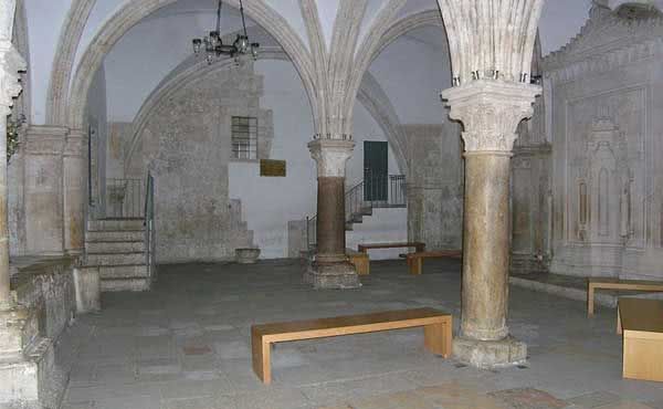 O acesso ao Cenáculo é através de um edifício anexo, subindo uma escadaria interior e atravessando um terraço a céu aberto. Trata-se de uma sala de uns 15 metros de comprimento e 10 de largura, praticamente sem adornos nem mobiliário. Várias pilastras nas paredes e duas colunas no centro, com capitéis antigos reutilizados, sustentam um teto em abóbada. Nos fechos da abóbada ficaram restos de relevos com figuras de animais; entre os quais é visível um cordeiro.