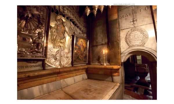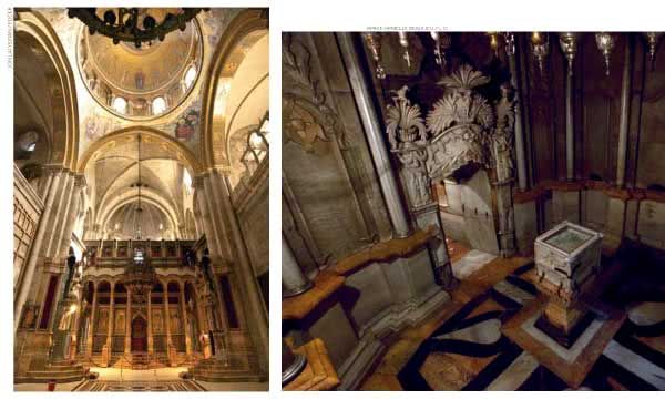 O interior consta de uma câmara e de antecâmara, que se comunicam através de uma abertura baixa e estreita. A câmara mede três metros e meio de comprimento por quatro de largura, e reproduz o vestíbulo do hipogeu original, que foi eliminado já no tempo de Constantino. Chama-se Capela do Anjo em recordação da criatura celestial que, sentada sobre a grande pedra que fechava o sepulcro, apareceu às mulheres para anunciar a ressurreição. Uma parte dessa rocha está guardada no centro da sala, dentro de um pedestal; até à destruição da basílica em 1009 por ordem de El-Hakim, tinha sido conservada inteira. A fúria do sultão também atingiu a antecâmara, que corresponde exatamente ao túmulo do Senhor, embora os estragos tenham sido rapidamente reparados. O lugar onde José de Arimateia e Nicodemos depositaram o corpo de Jesus encontra-se à direita, paralelo à parede, coberto por lajes de mármore. Aí, “ressuscitou ao terceiro dia”[15]. Compreende-se perfeitamente a piedade com que os peregrinos entram neste espaço reduzido, onde, além do mais, é possível celebrar a Santa Missa a determinadas horas do dia.