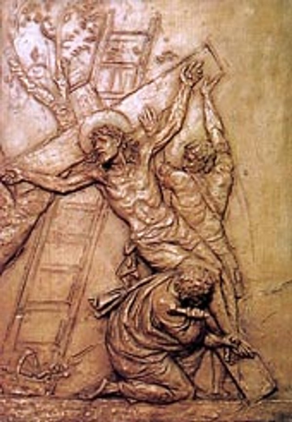 Levaram então consigo Jesus. Ele próprio carregava a sua cruz para fora da cidade, em direção ao lugar chamado Calvário, em hebraico Gólgota.. Ali o crucificaram, e com ele outros dois, um de cada lado, e Jesus no meio. Pilatos redigiu também uma inscrição e a fixou por cima da cruz. Nela estava escrito: «Jesus de Nazaré, rei dos judeus». Muitos dos judeus leram essa inscrição, porque Jesus foi crucificado perto da cidade e a inscrição era redigida em hebraico, em latim e em grego. Os sumos sacerdotes dos judeus disseram a Pilatos: