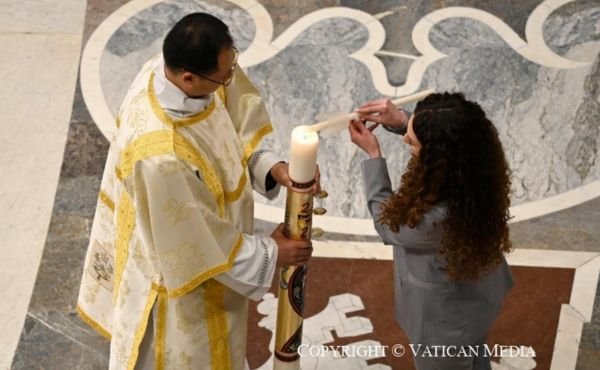Assim, queridos irmãos e irmãs, no início desta celebração, o diácono exaltou a luz de Cristo Ressuscitado, simbolizada no Círio Pascal. A partir deste único Círio, todos acendemos as nossas velas e, cada um levando uma pequena chama tirada do mesmo fogo, iluminamos esta grande basílica. É o sinal da luz pascal, que nos une na Igreja como lâmpadas para o mundo. À proclamação do diácono respondemos “amém”, afirmando o nosso compromisso de abraçar esta missão, e dentro de pouco repetiremos o nosso “sim”, renovando as Promessas Batismais.