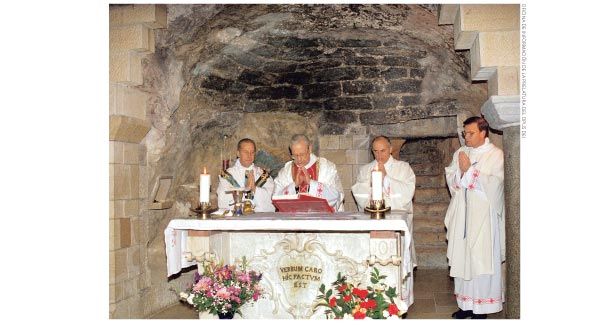 Nesta gruta, lá em baixo, onde está o sinal, o Verbo se fez carne. O Deus Todo-Poderoso, infinitamente grande, assume a carne humana. Onde? Numa casa cheia de pobreza. E onde ele nasceu também? Em outra gruta, que agora, com o passar dos anos, está muitos metros abaixo do solo. O Senhor esteve ali. Foi aí que o Senhor nasceu. Para quê? Para nos dar vida. Ele se tornou mortal, vivendo dessa maneira – e depois, morrendo como morreu – para que pudéssemos viver.