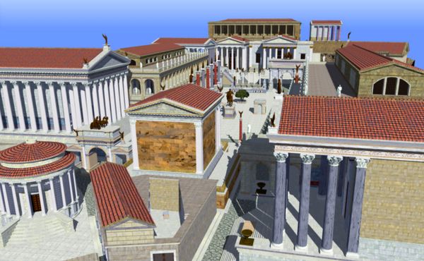 Que contraste entre as modestas construções dos bairros populares e a magnificência dos edifícios públicos…! Estes últimos refletiam o imenso poderio do Império e eram como um compêndio da história de Roma.