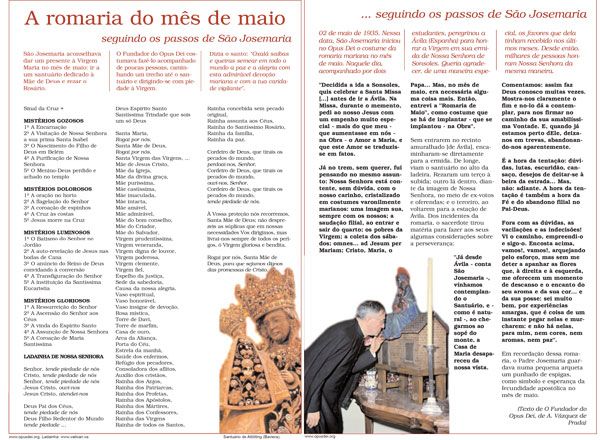 Descobrimos assim - como se recitássemos pela primeira vez - o sentido das orações marianas, que sempre se rezaram na Igreja. Que são a Ave-Maria e o Angelus senão louvores ardentes à Maternidade divina? E no Santo Rosário - essa maravilhosa devoção que nunca me cansarei de aconselhar a todos os cristãos - passam pela nossa cabeça e pelo nosso coração os mistérios da conduta admirável de Maria, que são os próprios mistérios fundamentais da fé.