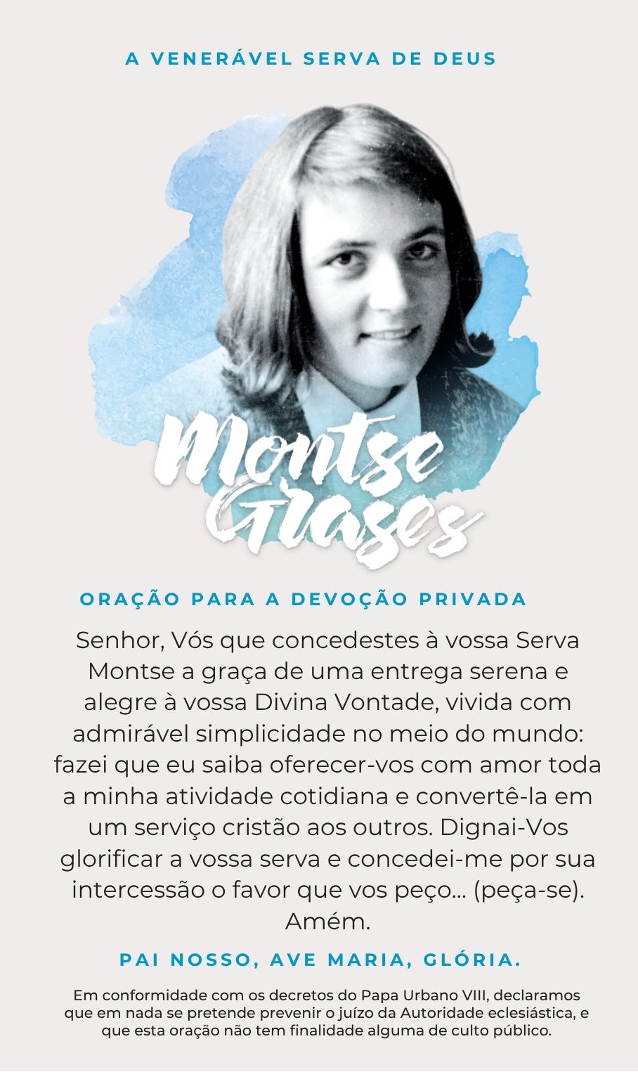 Senhor, Vós que concedestes à vossa Serva Montse a graça de uma entrega serena e alegre à vossa Divina Vontade, vivida com admirável simplicidade no meio do mundo: fazei que eu saiba oferecer-vos com amor toda a minha atividade cotidiana e convertê-la em um serviço cristão aos outros. Dignai-Vos glorificar a vossa serva e concedei-me por sua intercessão o favor que vos peço... (peça-se). Amém.