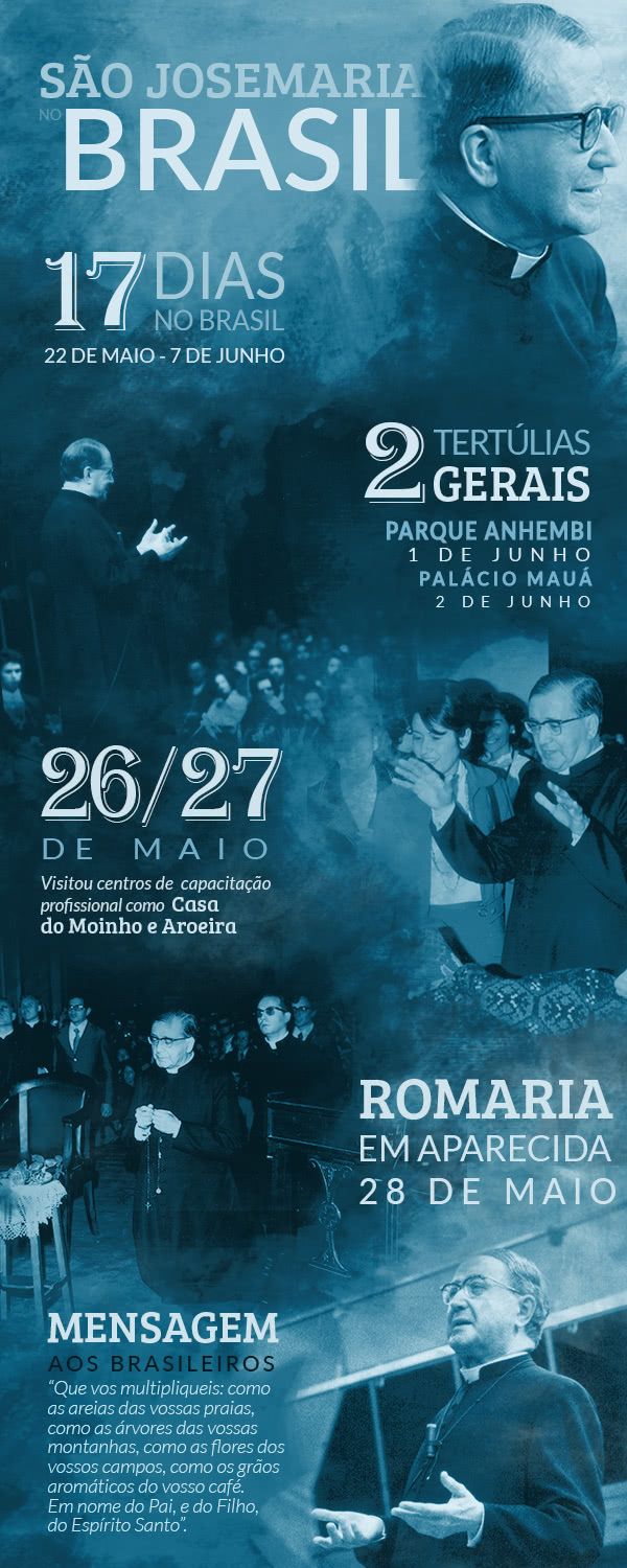 Dia 22 de maio é aniversário da chegada de São Josemaria no Brasil. Este infográfico mostra alguns momentos marcantes desses dias.