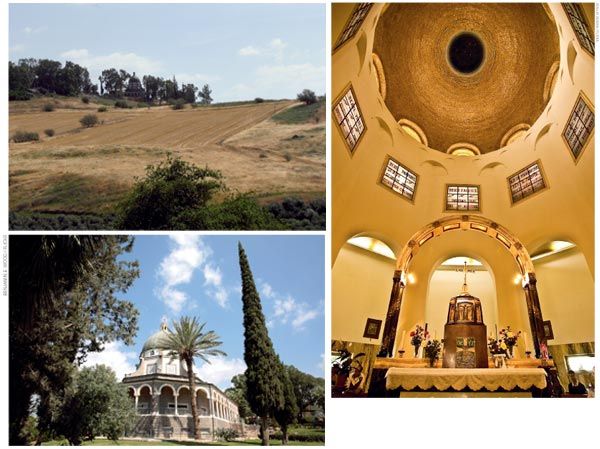 De acordo com a tradição dos cristãos que habitaram nesta zona desde a época de Jesus, o Sermão da Montanha (o conjunto de ensinamentos do Senhor que começa com as Bem-Aventuranças) foi pronunciado perto da igreja da Multiplicação dos pães e dos peixes, na ladeira de um monte próximo, onde havia uma gruta. Com efeito, a uns cem metros desse santuário, em 1935, foram escavados os restos de alguns edifícios. Pertenceriam a uma igreja e um mosteiro do séc. IV ou V. A capela, de sete metros de comprimento por quatro de largura, construída escavando por cima de uma pequena gruta, abarcava outra gruta natural, transformada em forma quadrada por meio de alvenaria. Numerosos grafitos cobriam o reboco das paredes, e o chão estava pavimentado com mosaicos.