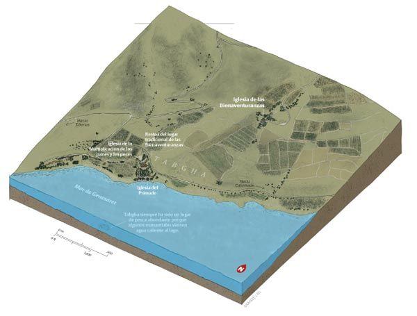 Tabgha é um lugar situado a uns três quilômetros a oeste de Cafarnaum, que se estende por alguns hectares da margem do lago para o interior, em diração às colinas que o rodeiam. O nome parece ser uma derivação árabe do original bizantino Heptapegon, que em grego significa “sete fontes”: deve-se às nascentes que então existiam, e que continuam ativas até hoje. De acordo com a tradição dos cristãos que habitaram ininterruptamente aquela zona desde o tempo de Jesus, ali teria multiplicado os cinco pães e os dois peixes para dar de comer a uma multidão (Cfr. Mt 14, 13-21; Mc 6, 32-44; Lc 9, 12-17; Jo 6, 1-15); ali teria pronunciado o Sermão da Montanha que começa com as Bem-Aventuranças (Cf. Mt 5, 1-11; Lc 6, 17-26); e teria aparecido aos Apóstolos depois da Ressurreição, quando realizou a segunda pesca milagrosa e confirmou São Pedro como primaz da Igreja (Cf. Jo 21, 1-23). Menos de cem de metros separam os três lugares onde se situam estes episódios da vida do Senhor.