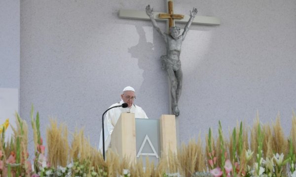 Hoje a verdadeira originalidade, a verdadeira revolução é rebelar-se contra a cultura do provisório, é ir além do instinto, além do instante, é amar por toda a vida e com todo o próprio ser. Não estamos cá para ir vivendo, mas para fazer da vida um empreendimento grandioso. Todos vós tereis em mente grandes histórias que lestes nos romances, vistes nalgum filme inesquecível, ouvistes nalgum conto comovente. Se pensardes bem, nas grandes histórias há sempre dois ingredientes: um é o amor, outro é a aventura, o heroísmo. Andam sempre juntos. Para tornar grande a vida, precisamos de ambos: amor e heroísmo. Fixemos Jesus, contemplemos o Crucifixo: estão presentes os dois, um amor sem limites e a coragem de dar a vida até ao fim, sem meias medidas. Aqui, diante dos nossos olhos, temos a Beata Ana (Kolesárová), uma heroína do amor. Diz-nos para apostarmos em metas altas. Por favor, não deixemos transcorrer os dias da vida como episódios duma telenovela.