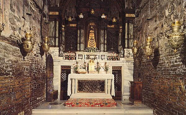 «Segundo uma tradição multissecular, desde 1294, a Santa Casa de Nazaré está na colina de Loreto, sob o cruzeiro da Basílica edificada posteriormente. É retangular, com paredes de uns quatro metros e meio de altura. Uma delas é de construção moderna, mas as outras sem alicerces, enegrecidas pelo fumo das velas, são originais. Tanto a estrutura, como a formação geológica dos materiais não têm nenhuma semelhança com as características da antiga arquitetura da zona: é perfeitamente análoga às construções que se faziam na Palestina há vinte séculos: silhares de pedra arenosa, que utilizavam a cal como elemento de união.