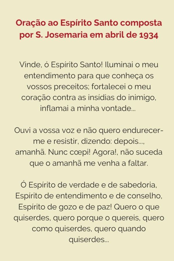 Vinde, ó Espírito Santo! Iluminai o meu entendimento para que conheça os vossos preceitos; fortalecei o meu coração contra as insídias do inimigo, inflamai a minha vontade... Ouvi a vossa voz e não quero endurecer-me e resistir, dizendo: depois..., amanhã. Nunc cœpi! Agora!, não suceda que o amanhã me venha a faltar.