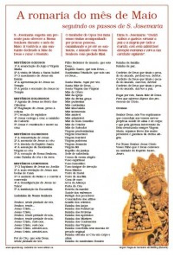 A romaria de Maio é uma visita a Nossa Senhora feita com amor filiar. S. Josemaria rezava os três terços do Rosário: um no caminho de ida; outro, normalmente o terço do dia com a ladainha, no santuário ou diante da imagem de Nossa Senhora que tinha ido visitar, e o terceiro, no caminho de regresso.